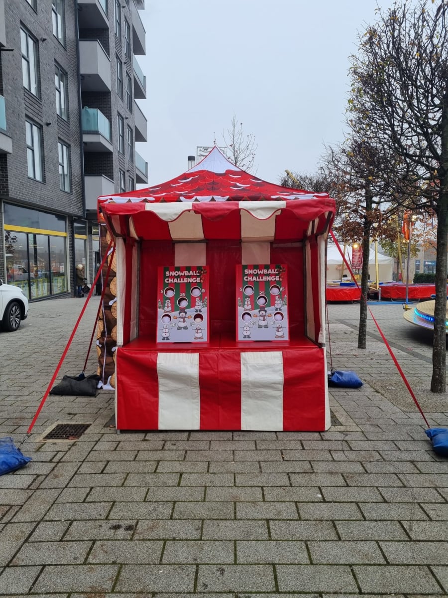 A fantastic fun game for all ages to play. Snowball Challenge Side Stall Hire A great Christmas Side Stall Game. 2 players compete to see how many snowballs they can get through the holes to get the highest score.